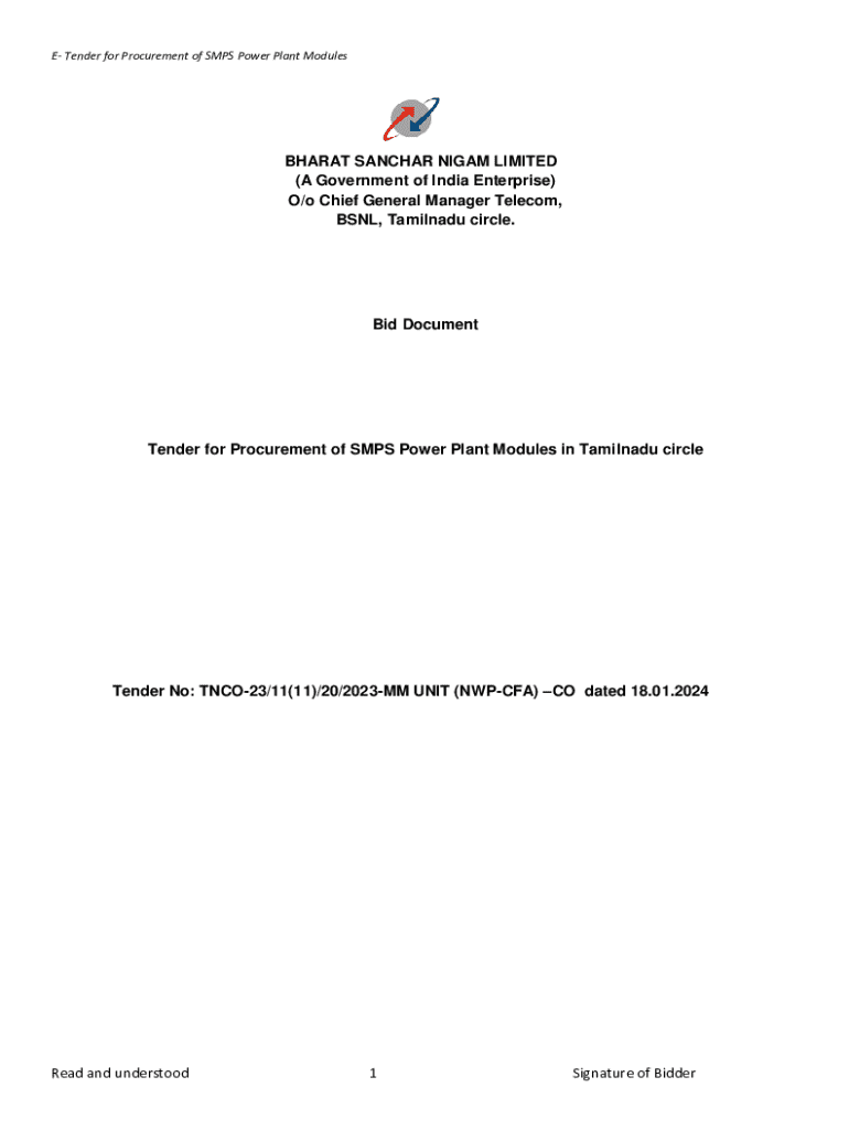 BSNL, Tamil Nadu circle. Bid DocumentTender for