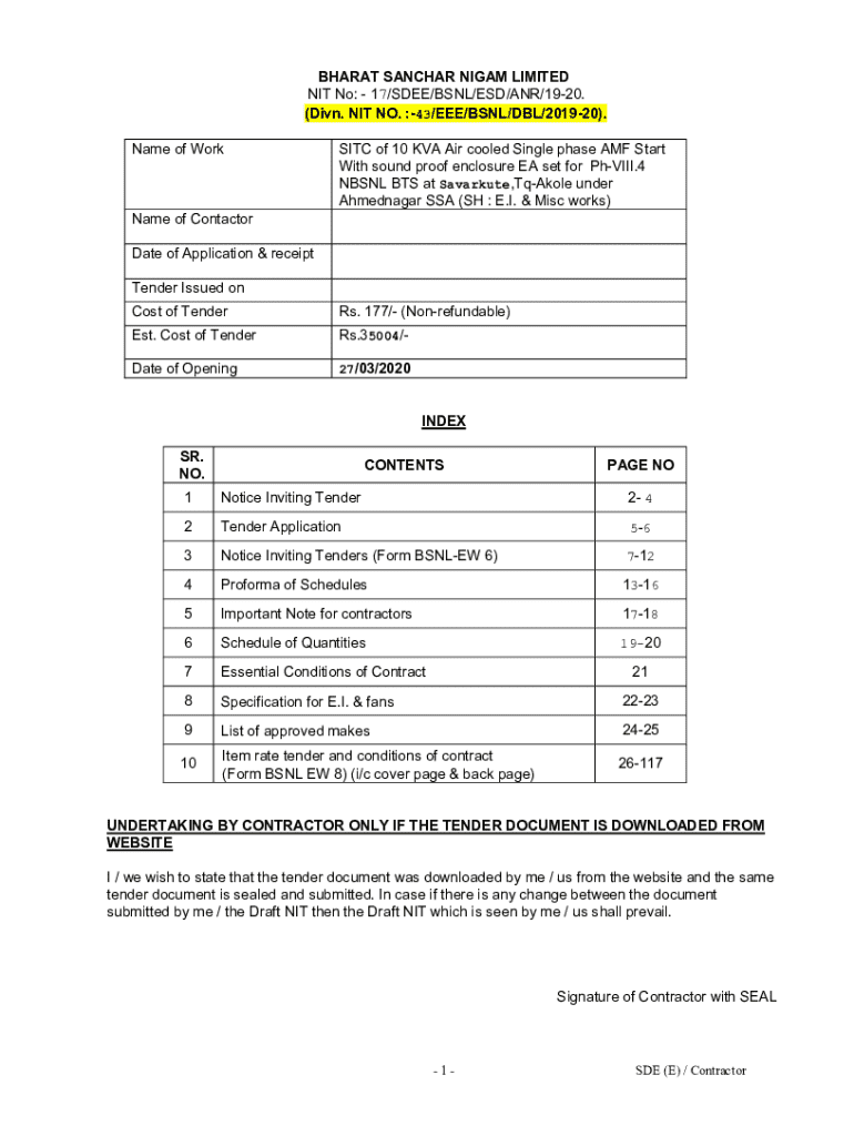 (Dive. NIT NO. 43/EEE/BSNL/DBL/201920). Name of ContactorS ITC of 10 AVA Air cooled Single phase AMF Start