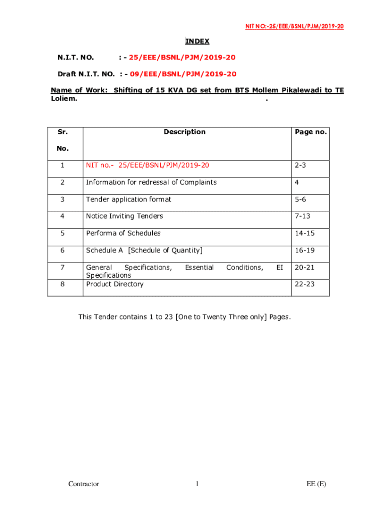 NIT NO:25/EEE/BSNL/PM/201920INDEX
