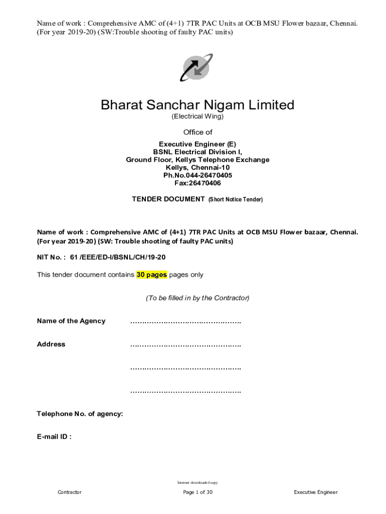 Get the free Name of work : Comprehensive AMC of (4+1) 7TR PAC Units at OCB MSU Flower bazaar, Ch...