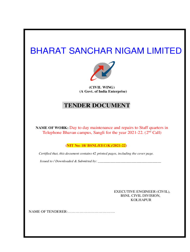 (A Govt. of India Enterprise)TENDER DOCUMENTARY OF WORK: Day to day maintenance and repairs to Staff quarters telephone Haven campus, Single for the year 202122.