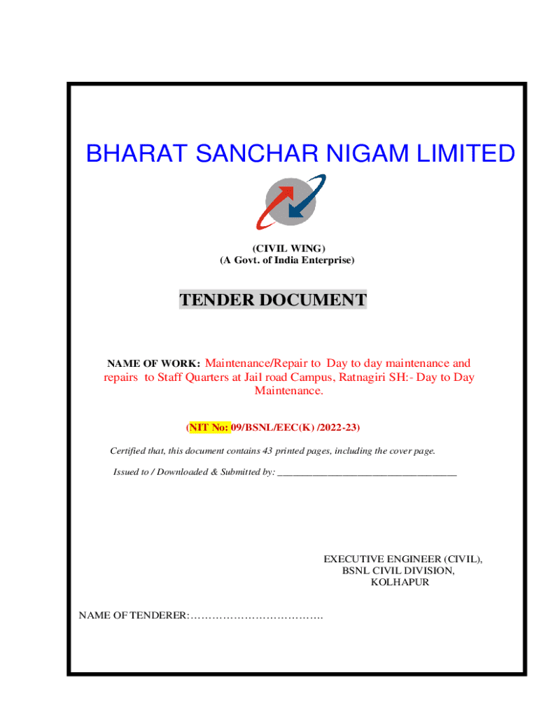 (A Govt. of India Enterprise)TENDER DOCUMENTARY OF WORK: Maintenance/Repair to Day maintenance and repairs to Staff Quarters at Jail road Campus, Ratnagiri