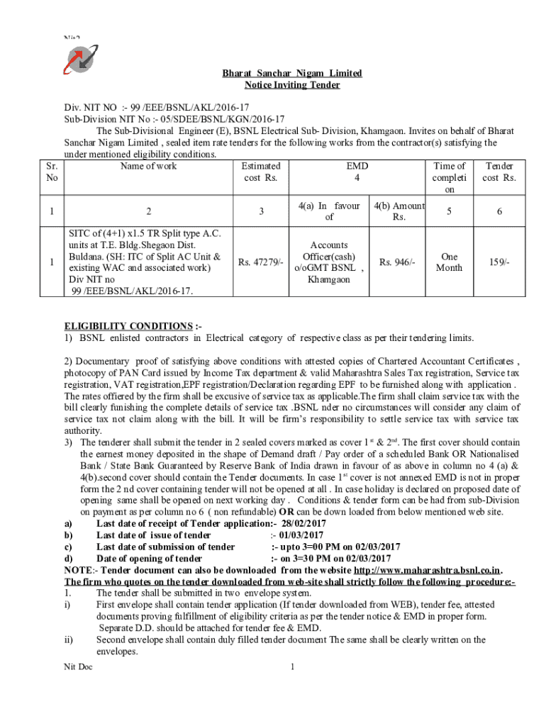 Subdivision NIT No : 05/SEE/BSNL/KG/201617