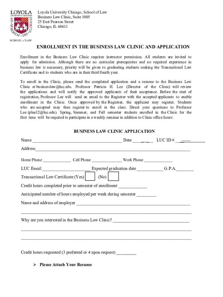 Loyola University Chicago, School of Law Business Law Clinic, Suite 1005 25 East Pearson Street Chicago, IL 60611ENROLLMENT IN THE BUSINESS LAW CLINIC AND APPLICATION Enrollment in the Business Law