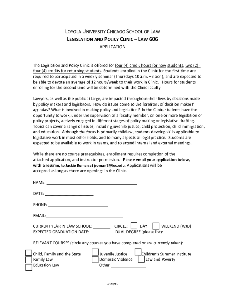 LOYOLA UNIVERSITY CHICAGO SCHOOL OF LAW LEGISLATION AND POLICY CLINIC LAW 606 APPLICATION The Legislation and Policy Clinic is offered for four (4) credit hours for new students; two (2) four (4)