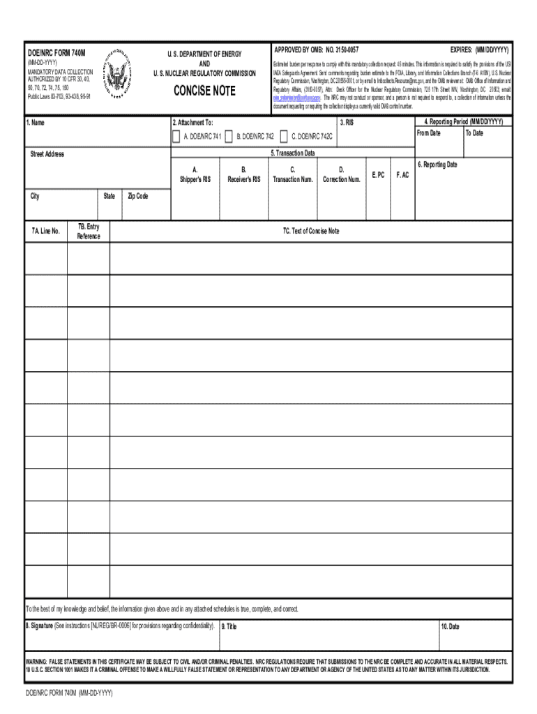 DOE/NRC FORM 740MU. S. DEPARTMENT OF ENERGY AND U. S. NUCLEAR REGULATORY COMMISSION(MMDDYYYY) MANDATORY DATA COLLECTION AUTHORIZED BY 10 CFR 30, 40, 50, 70, 72, 74, 75, 150 Public Laws 83703, 93438,