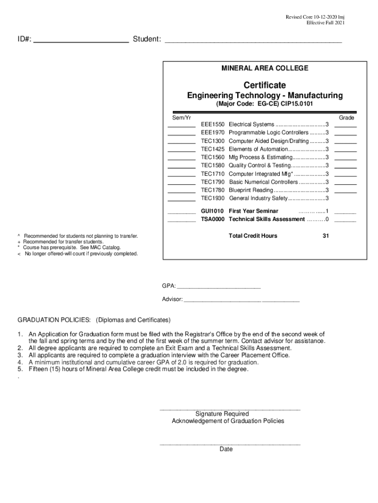 Effective Fall 2021ID#:Student: ___MINERAL AREA COLLEGECertificate