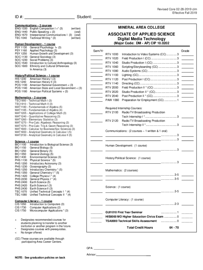 Revised Core 02282019 CLM Effective Fall 2019ID #:Student:Communications 2 courses ENG 1330 English Composition I +* (3) (written) ENG 1440 Public Speaking + (3) (oral) ENG 1670 Interpersonal Communications