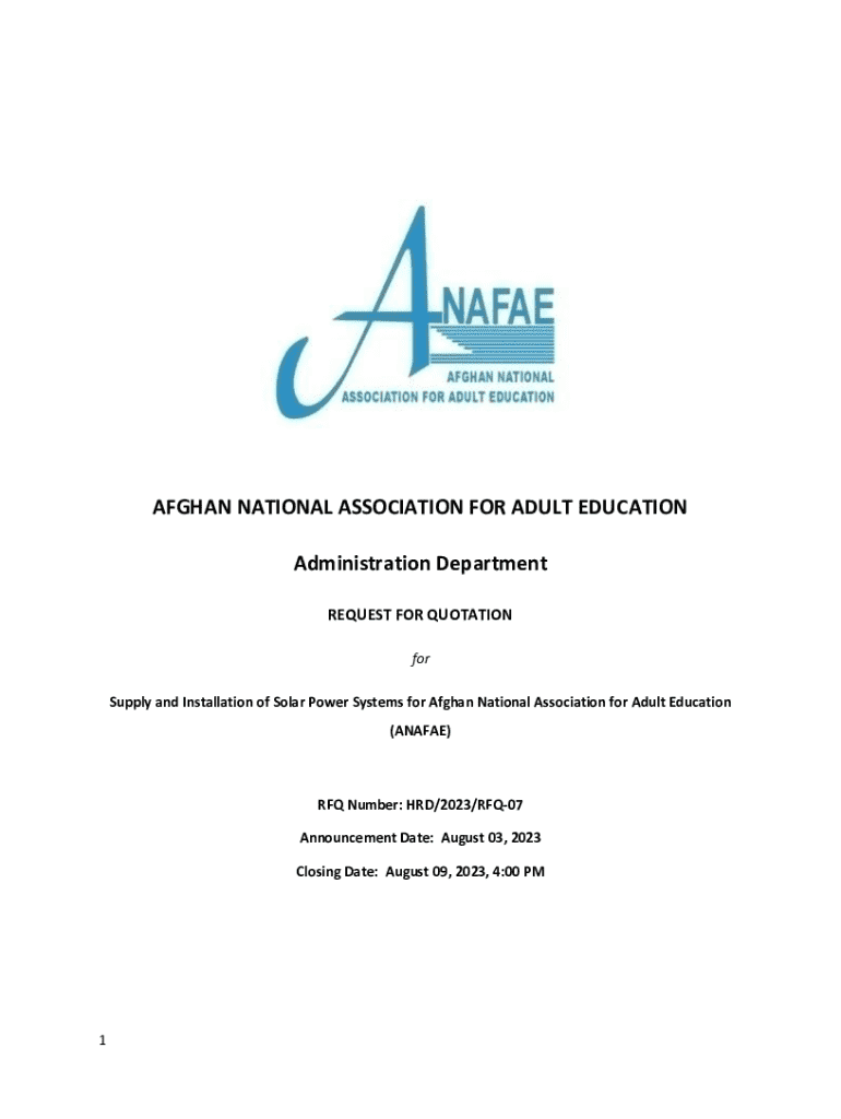 Supply and Installation of Solar Power Systems for Afghan National Association for Adult Education