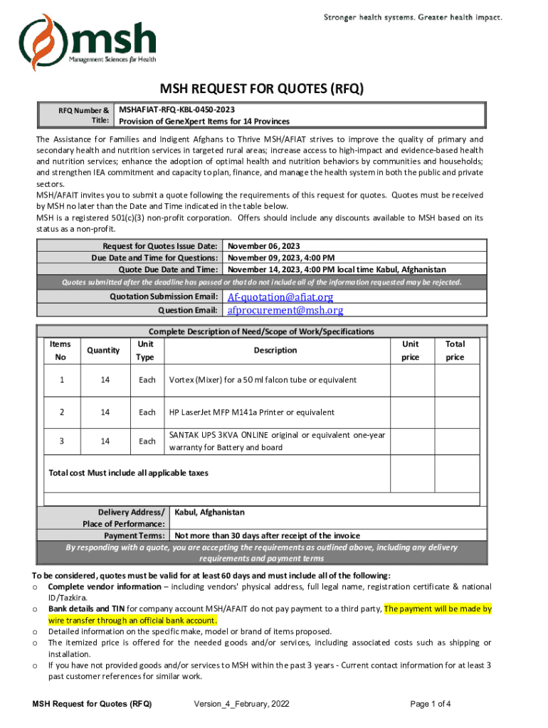 MSHREQUESTFORQUOTES(RFQ) RFQNumber& MSHAFIATRFQKBL04502023 Title: ProvisionofGeneXpertItemsfor14Provinces The Assistance for Families and Indigent Afghans to Thrive MSH/AFIAT strives to improve the