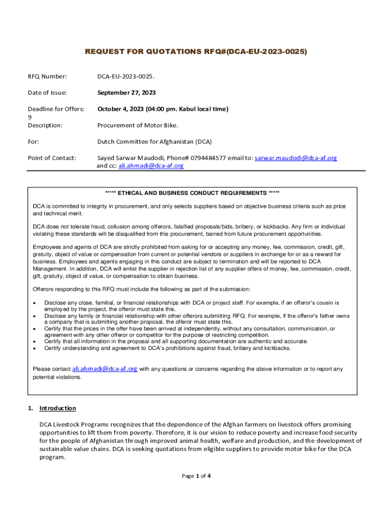 REQUEST FOR QUOTATIONS RFQ#(DCAEU20230025)RFQ Number:DCAEU20230025.Date of Issue:September 27, 2023Deadline for Offers: 9 Description:October 4, 2023 (04:00 pm. Kabul local time)For:Dutch Committee