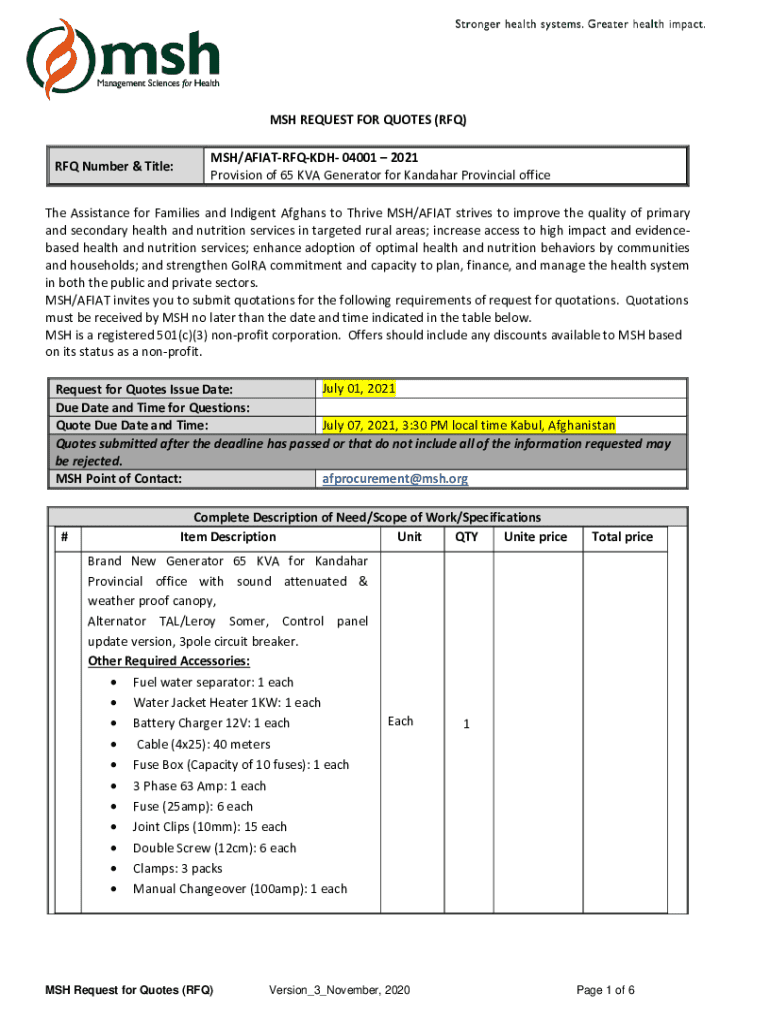 MSH REQUEST FOR QUOTES (RFQ) RFQ Number & Title:MSH/AFIATRFQKDH 04001 2021 Provision of 65 KVA Generator for Kandahar Provincial officeThe Assistance for Families and Indigent Afghans to Thrive MSH/AFIAT