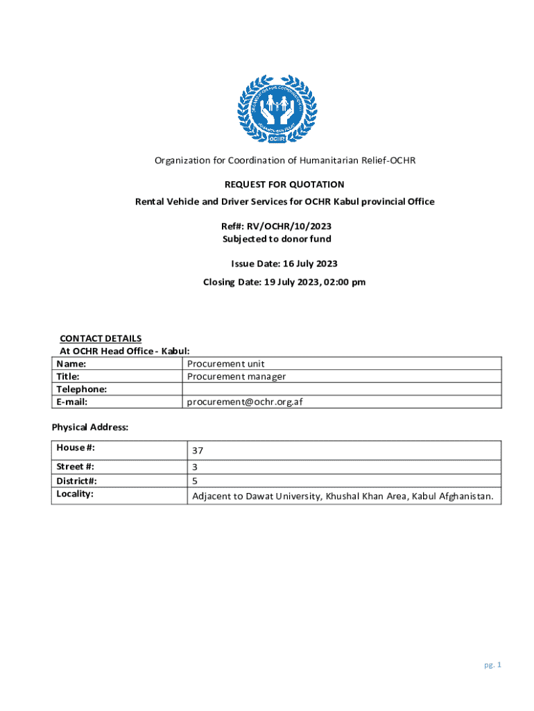 Organization for Coordination of Humanitarian ReliefOCHR REQUEST FOR QUOTATION Rental Vehicle and Driver Services for OCHR Kabul provincial Office Ref#: RV/OCHR/10/2023 Subjected to donor fund Issue