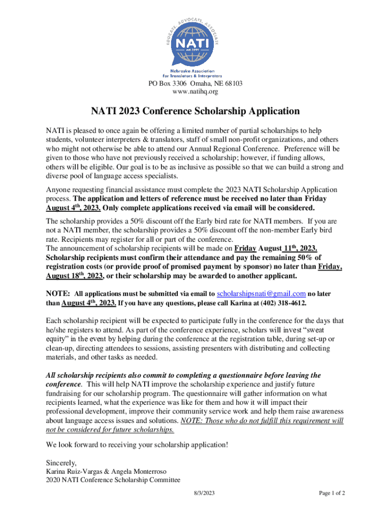 PO Box 3306 Omaha, NE 68103 www.natihq.orgNATI 2023 Conference Scholarship Application NATI is pleased to once again be offering a limited number of partial scholarships to help students, volunteer