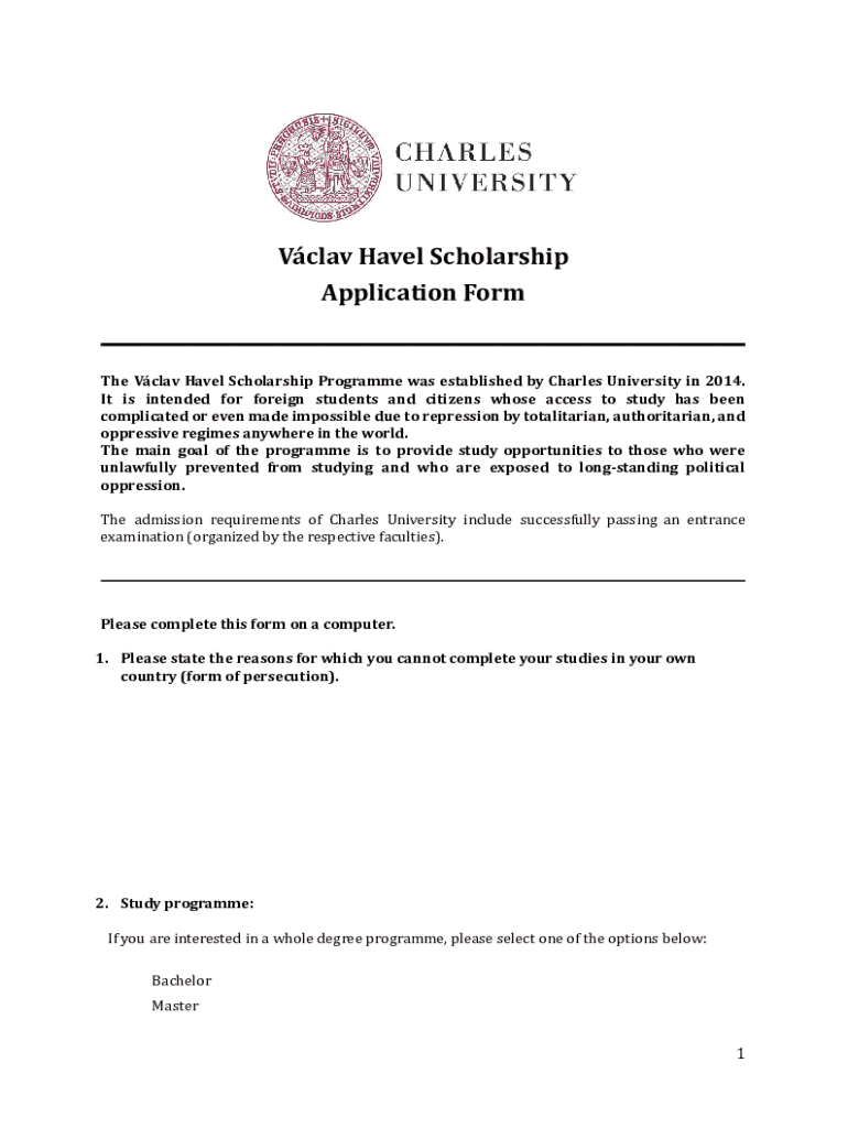 Vclav Havel Scholarship Application FormThe Vclav Havel Scholarship Programme was established by Charles University in 2014. It is intended for foreign students and citizens whose access to study