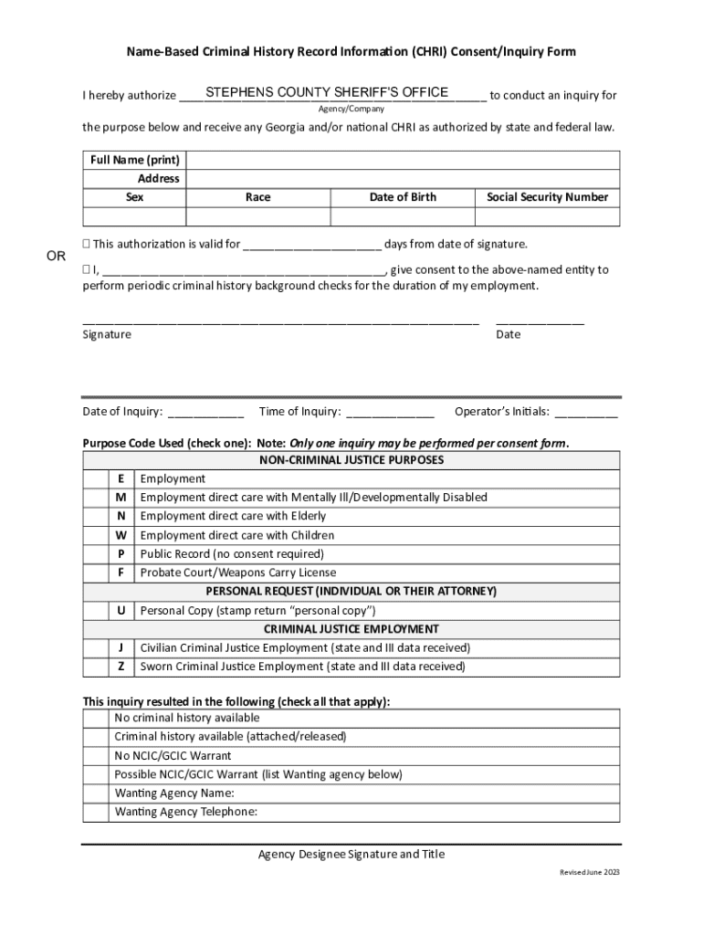 Namesake Criminal History Record Information (CHRIS) Consent/Inquiry Form