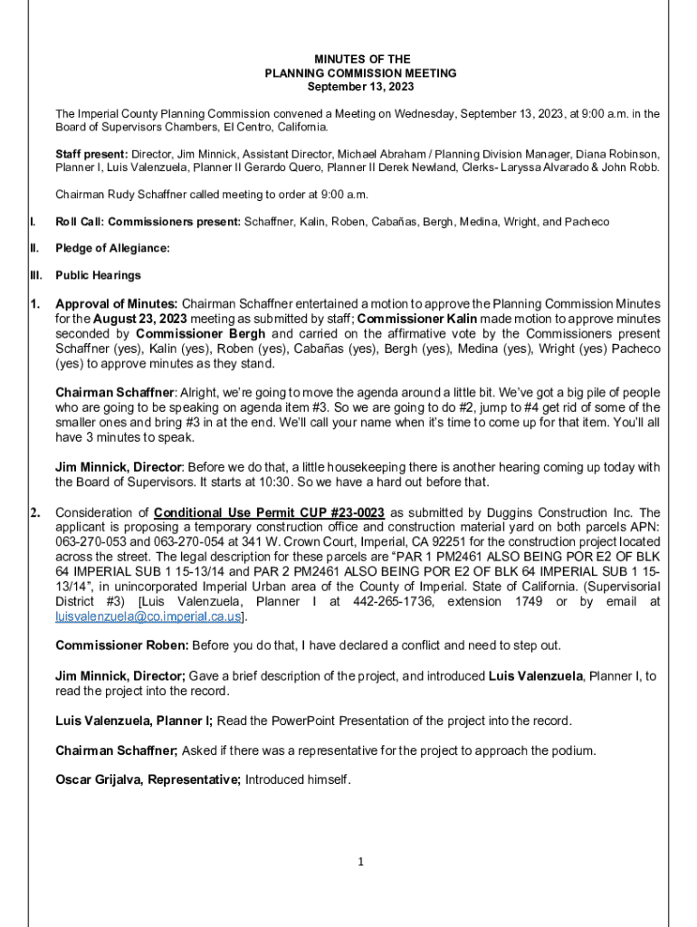 MINUTES OF THE PLANNING COMMISSION MEETING September 13, 2023, The Imperial County Planning Commission convened a Meeting on Wednesday, September 13, 2023, at 9:00 a.m. in the Board of Supervisors