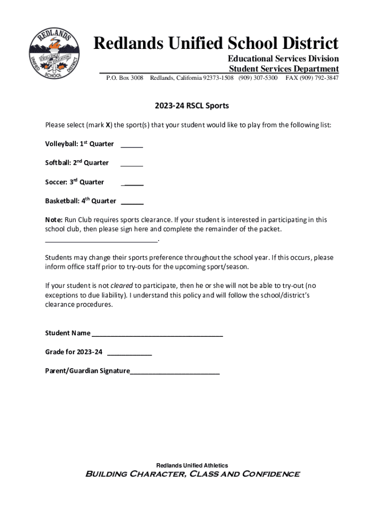 Get the free Redlands Student Connections League (RSCL) Athletic ...