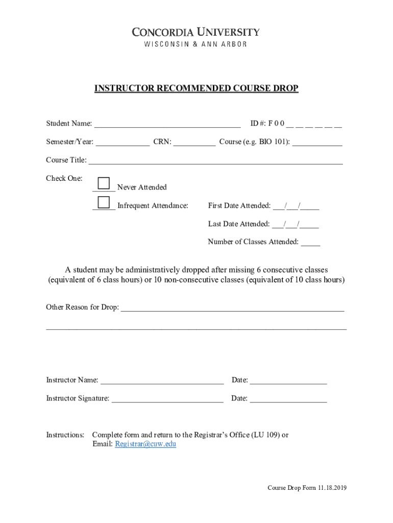 INSTRUCTOR RECOMMENDED COURSE DROPStudent Name: ___ID #: F 0 0 __ __ __ __ __ __Semester/Year: ___ CRN: ___ Course (e.g. BIO 101): ___ Course Title: ___ Check One:___ Never Attended ___ Infrequent