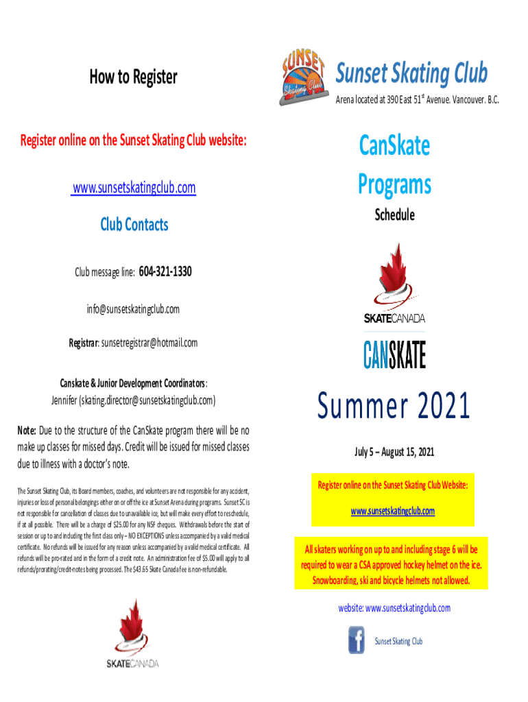 How to RegisterS unset Skating Club Arena located at 390 East 51st Avenue, Vancouver, B.C. Register online on the Sunset Skating Club website: www.sunsetskatingclub.comClub ContactsCanSkate Programs