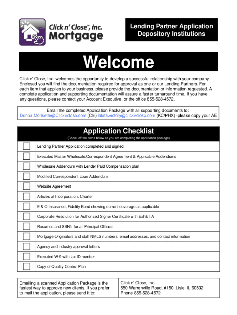 Lending Partner Application Depository InstitutionsWelcome Click n\' Close, Inc. welcomes the opportunity to develop a successful relationship with your company. Enclosed you will find the documentation