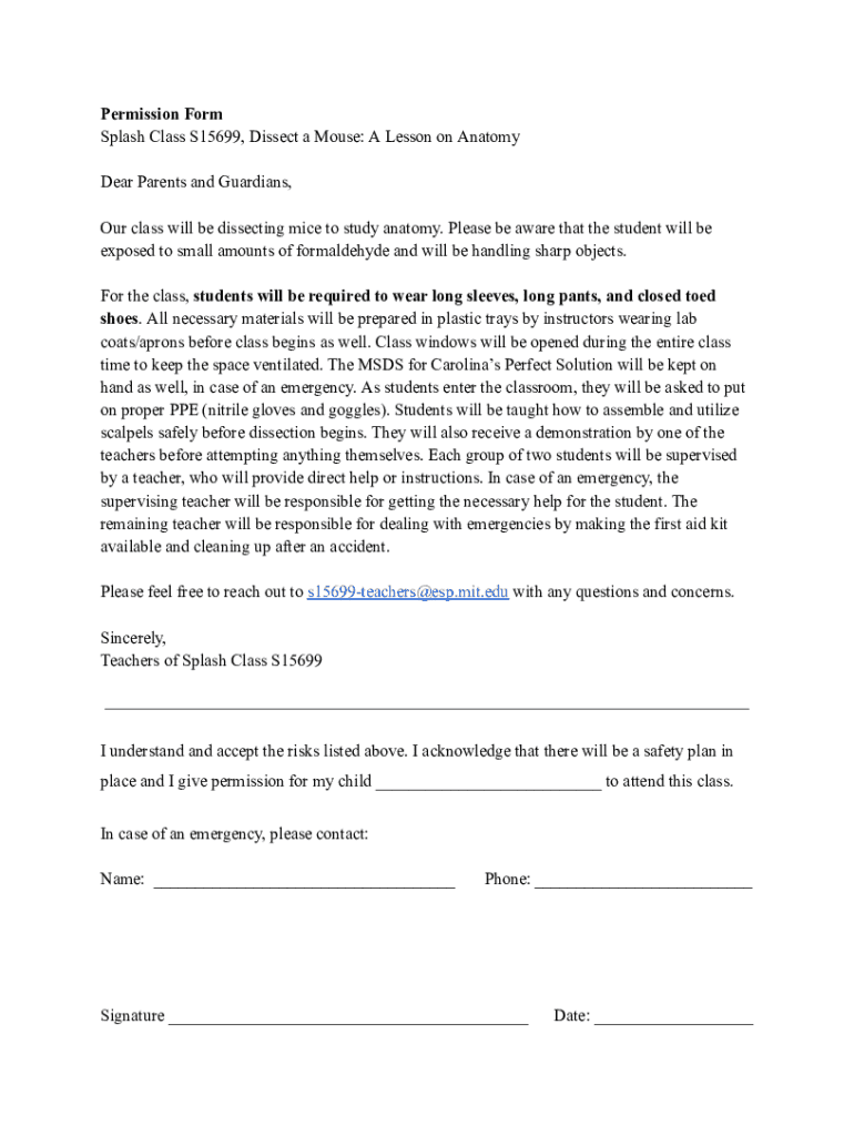 Permission Form Splash Class S15699, Dissect a Mouse: A Lesson on Anatomy Dear Parents and Guardians, Our class will be dissecting mice to study anatomy. Please be aware that the student will be exposed