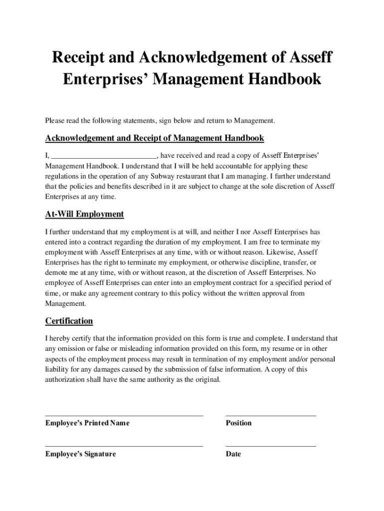 Please read the following statements, sign below and return to Management. Acknowledgement and Receipt of Management Handbook