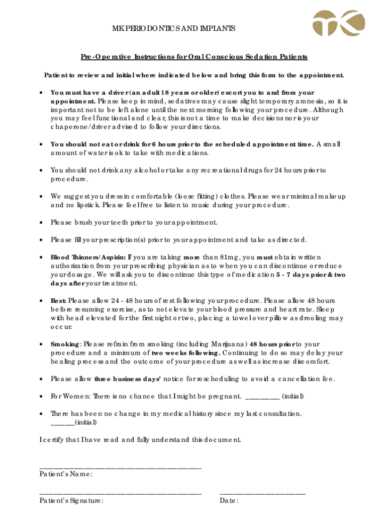 MK PERIODONTICS AND IMPLANTS Preoperative Instructions for Oral Conscious Sedation Patients Patient to review and initial where indicated below and bring this form to the appointment. You must have