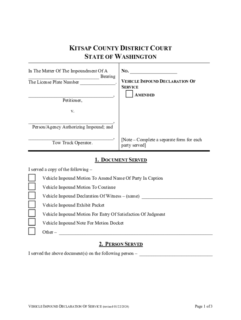KITSAP COUNTY DISTRICT COURT STATE OF WASHINGTON NO. ___ In The Matter Of The Impoundment Of A ___ Bearing The License Plate Number ___. VEHICLE IMPOUND DECLARATION OF SERVICE ___ AMENDED___, Petitioner,