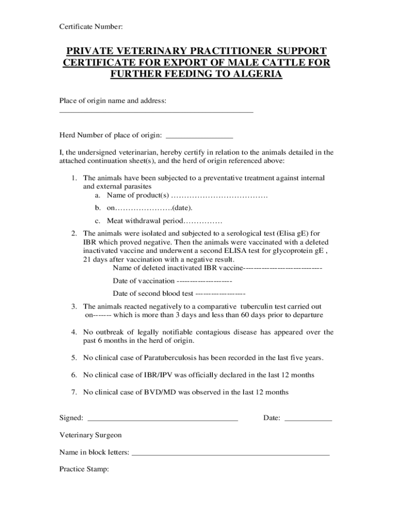 Certificate Number:PRIVATE VETERINARY PRACTITIONER SUPPORT CERTIFICATE FOR EXPORT OF MALE CATTLE FOR FURTHER FEEDING TO ALGERIA Place of origin name and address: ___Herd Number of place of origin: