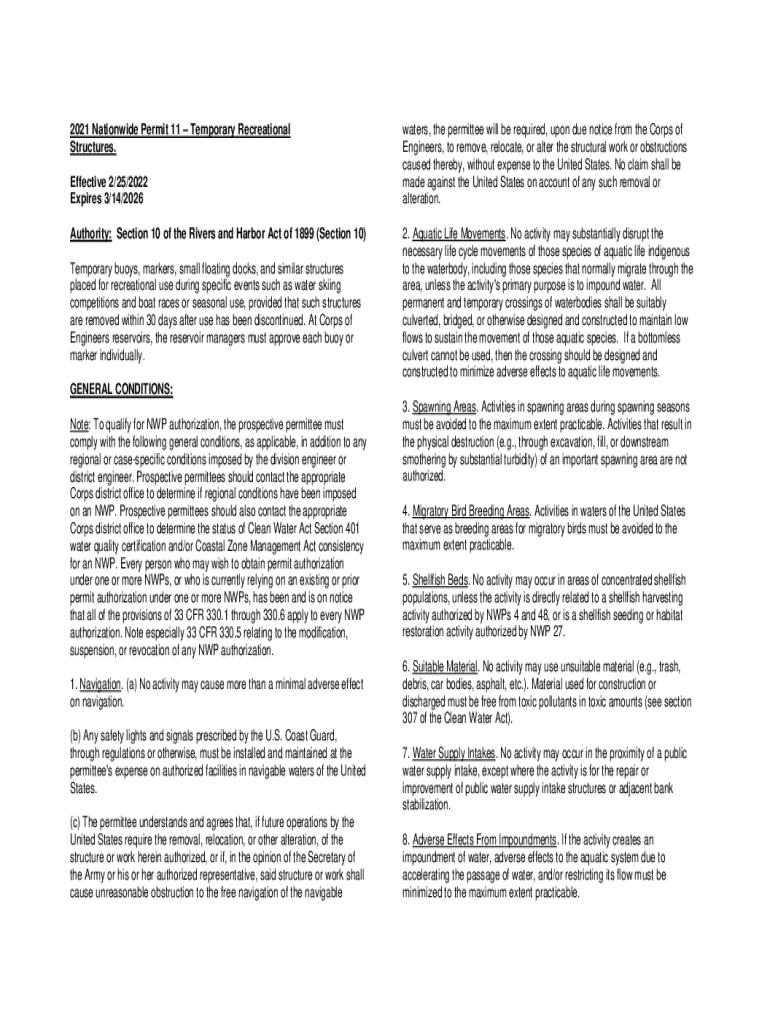 2021 Nationwide Permit 11 Temporary Recreational Structures. Effective 2/25/2022 Expires 3/14/2026 Authority: Section 10 of the Rivers and Harbor Act of 1899 (Section 10) Temporary buoys, markers,