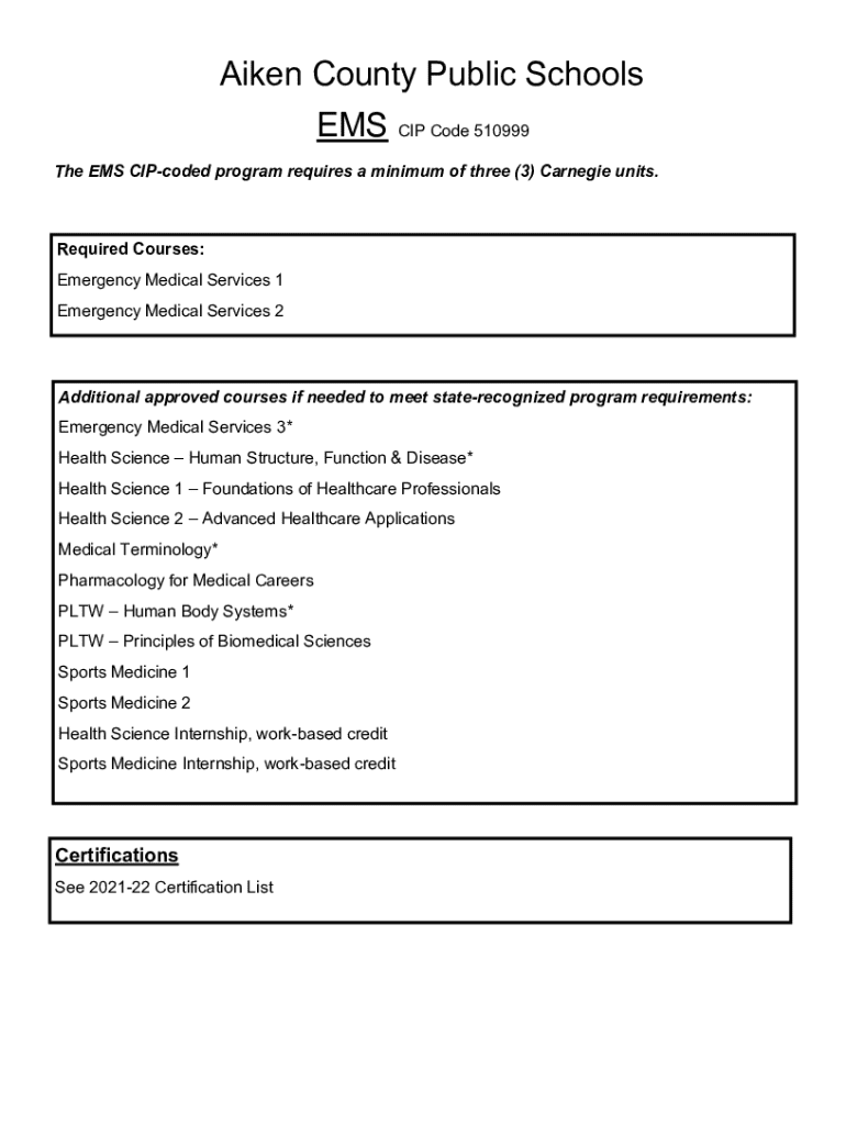 Aiken County Public Schools EMS CIP Code 510999 The EMS CIP coded program requires a minimum of three (3) Carnegie units. Required Courses: Emergency Medical Services 1 Emergency Medical Services