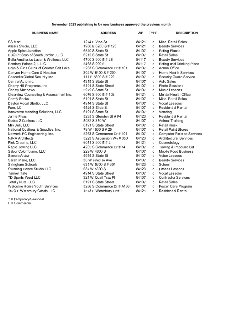 November 2023 publishing is for new business approved the previous month BUSINESS NAMES Mart Alisa\'s Studio, LLC Apple Spice Junction BBQ Pit Stop of South Jordan, LLC Bella Aesthetics Laser & Wellness