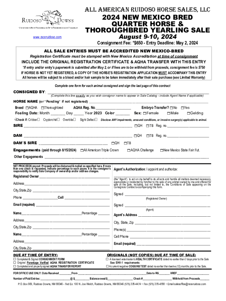 August 910, 2024www.raceruidoso.consignment Fee: *$650 Entry Deadline: May 2, 2024,