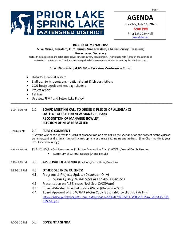 www.plslwd.orgBOARD OF MANAGERS:Mike Maser, President; Curt Hennas, Vice President; Charlie Cowley, Treasurer;