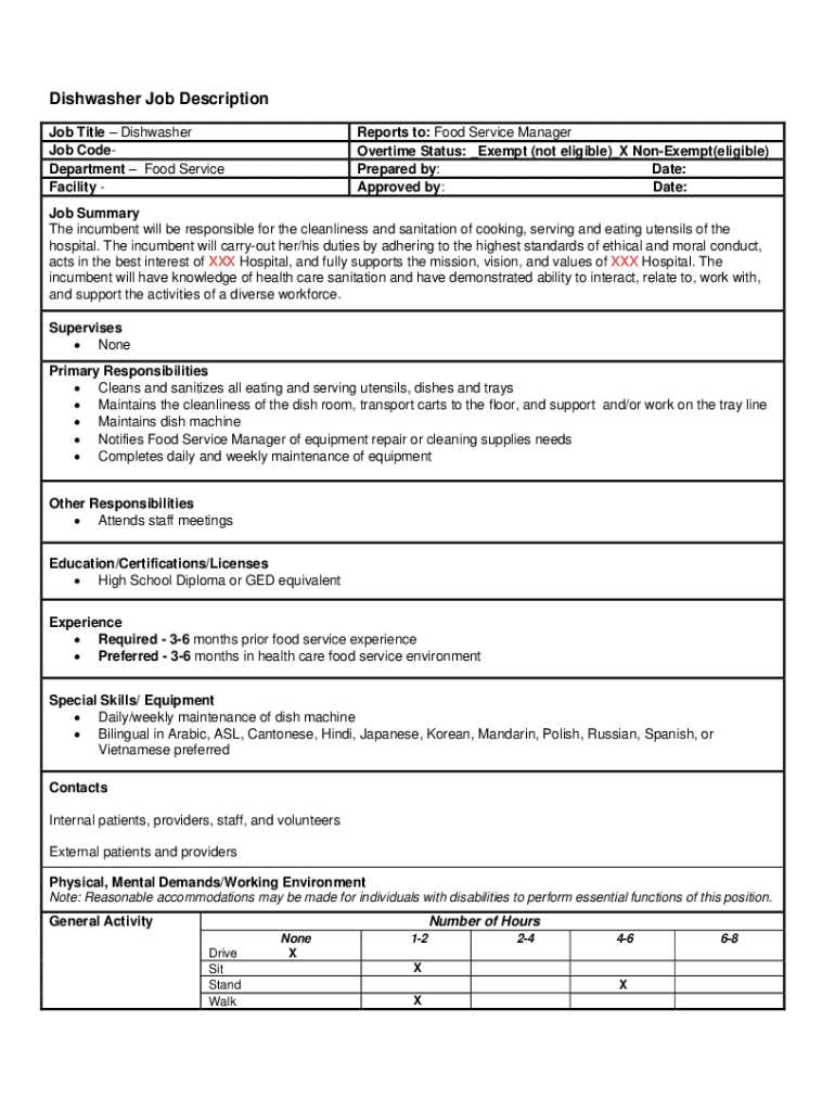 Fill out your dishwasher job description template online with pdfFiller!