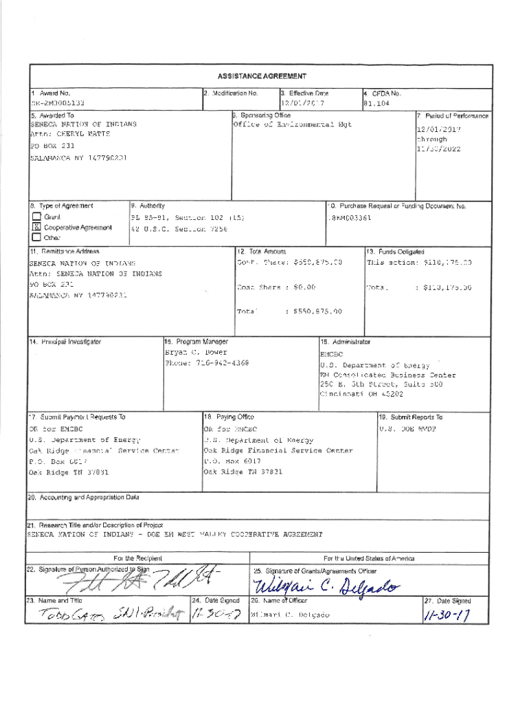 ASSISTANCE AGREEMENT2. Modification No.1. Award No.DEEM000513313.14\'Effective Date12/01/2017CFDANo.81.1045. Sponsoring Office5. Awarded To S EN ECA NATION OF INDIANS7. Period of PerformanceOf fice