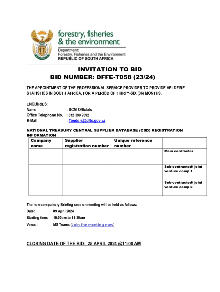 Get the free BID NUMBER: DFFE-T058 (23/24)