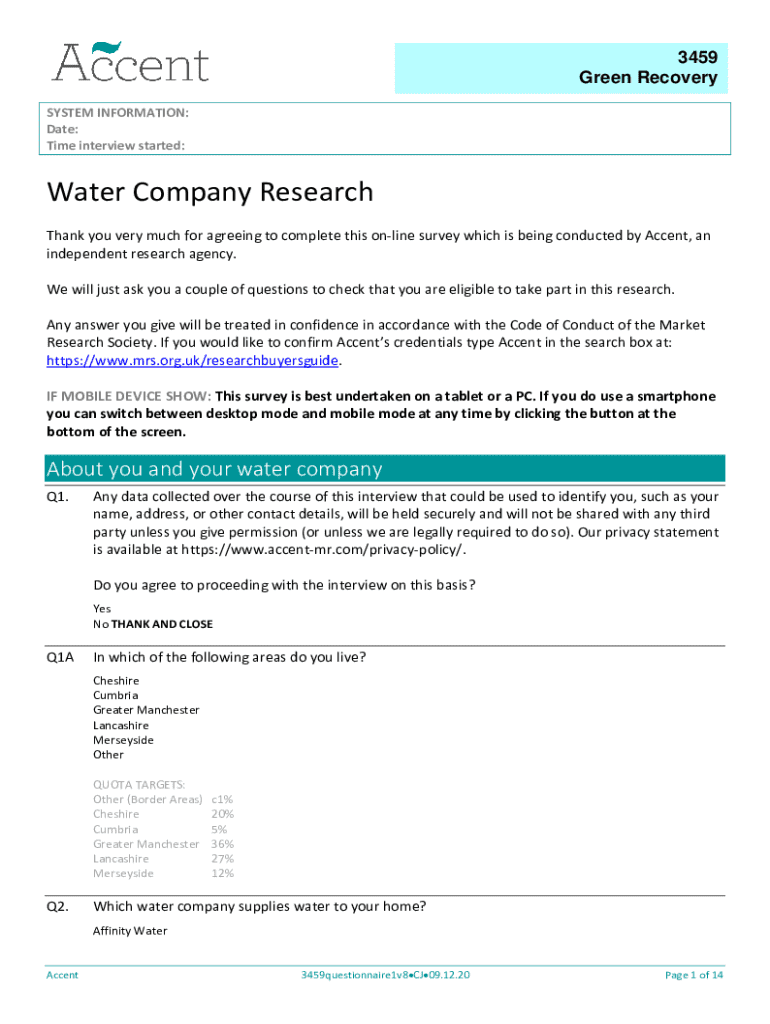 3459 Green Recovery SYSTEM INFORMATION: Date: Time interview started:Water Company Research Thank you very much for agreeing to complete this online survey which is being conducted by Accent, an independent