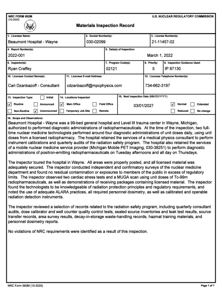 1. Licensee Name:2. Docket Number(s):3. License Number(s)Beaumont Hospital Wayne030020992111457024. Report Number(s):5. Date(s) of Inspection:2022001March