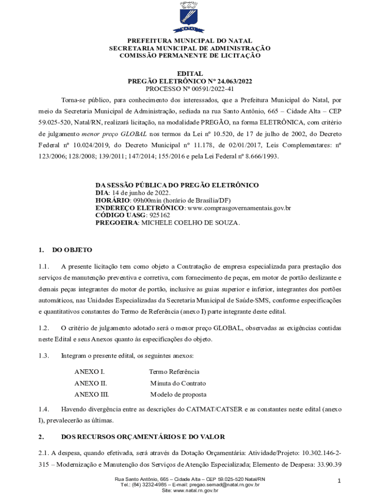 PREFEITURA MUNICIPAL DO NATAL SECRETARIA MUNICIPAL DE ADMINISTRAO COMISSO PERMANENTE DE LICITAOEDITAL PREGO ELETRNICO N 24.063/2022 PROCESSO N 00591/202241 Tornase pblico, para conhecimento dos interessados,