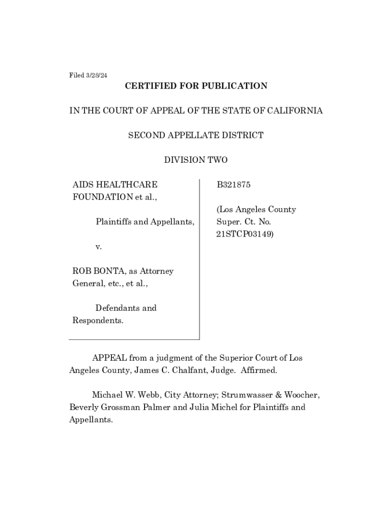 Filed 3/28/24CERTIFIED FOR PUBLICATION IN THE COURT OF APPEAL OF THE STATE OF CALIFORNIA SECOND APPELLATE DISTRICT DIVISION TWO AIDS HEALTHCARE FOUNDATION et al., Plaintiffs and Appellants, v. B321875