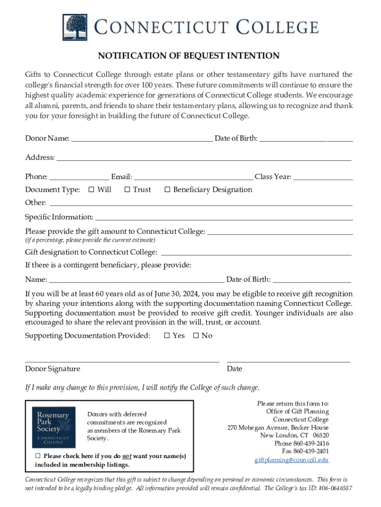 NOTIFICATION OF BEQUEST INTENTION Gifts to Connecticut College through estate plans or other testamentary gifts have nurtured the college\'s financial strength for over 100 years. These future commitments