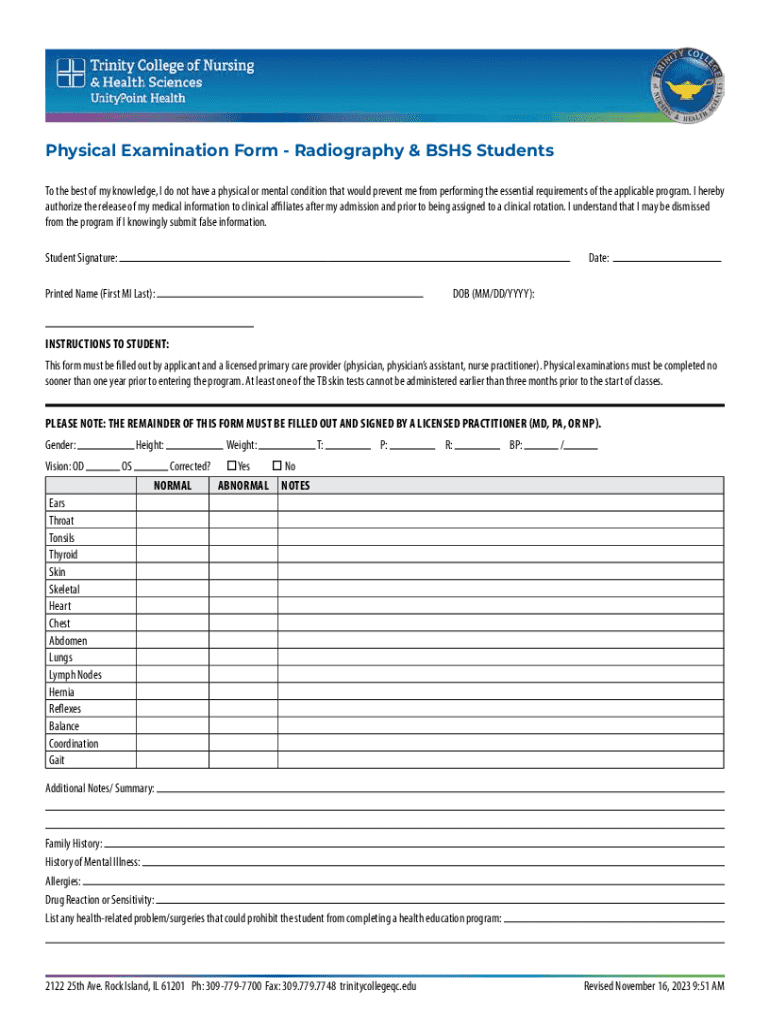 Get the free Physical Examination Form - Radiography & BSHS Students