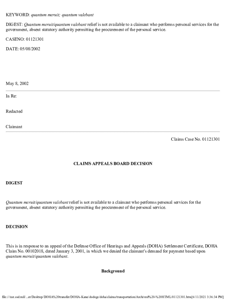 DIGEST: Quantum meruit/quantum valiant relief is not available to a claimant who performs personal services for the