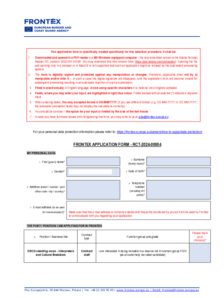 This application form is specifically created specifically for this selection procedure. It shall be: 1.Downloaded and opened in a PDF reader in a MS Windows equipped computer the recommended version