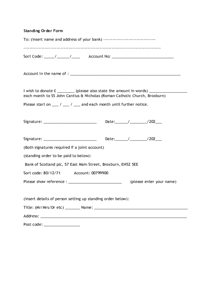 Standing Order Form To: (insert name and address of your bank) Sort Code: ___/___/___Account No: ___Account in the name of : ___I wish to donate ___ (please also state the amount in words) ___ each