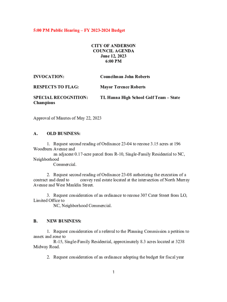 INVOCATION:Councilman John RobertsRESPECTS TO FLAG:Mayor Terence RobertsSPECIAL RECOGNITION:
