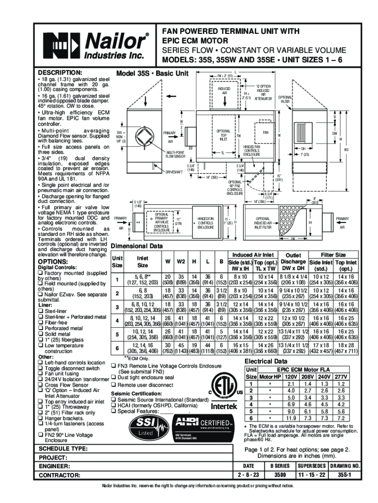 FAN POWERED TERMINAL UNIT WITH EPICECM MOTOR SERIES FLOW CONSTANT OR VARIABLE VOLUME MODELS: 35S, 35SW AND 35SE UNIT SIZES 1 6 DESCRIPTION:Model 35S Basic UnitIW + 2\" (51)L 18 ga. (1.31) galvanized