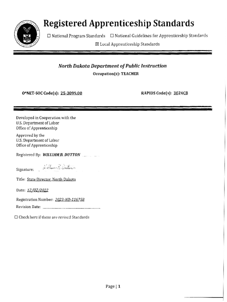 Registered Apprenticeship Standards 0 National Program StandardsNational Guidelines for Apprenticeship Standardsx Local Apprenticeship StandardsNorth Dakota Department ofPublic Instruction Occupation(s):